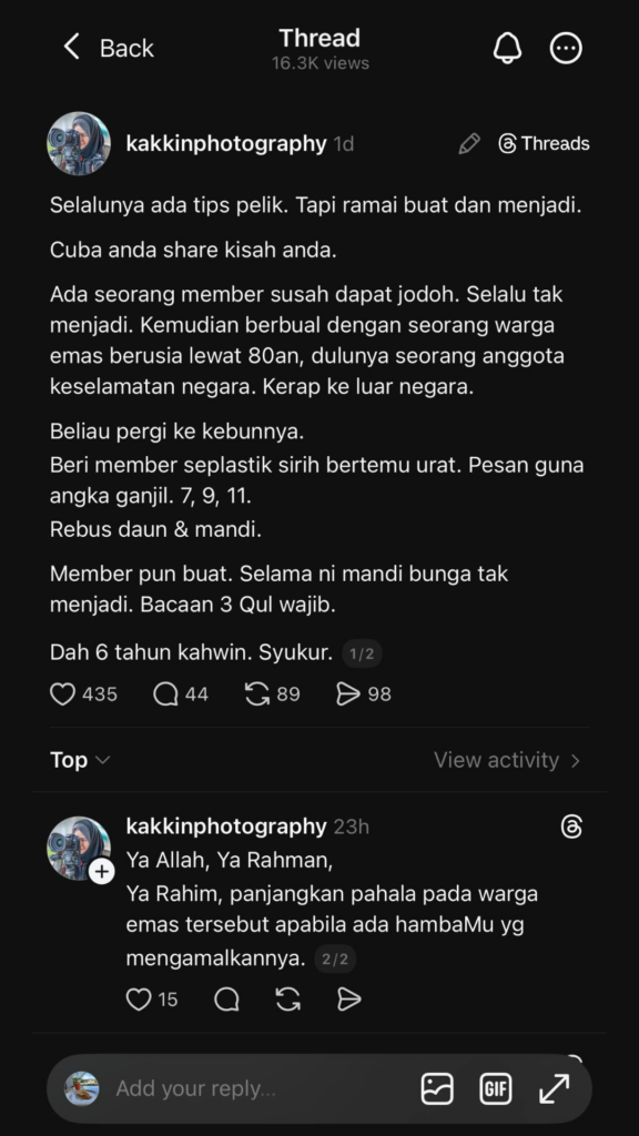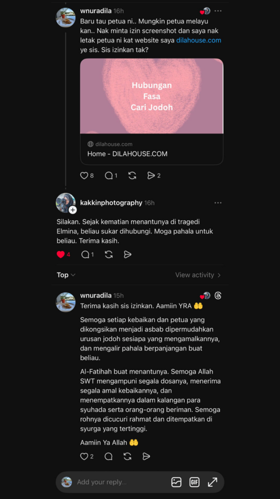 Semalam saya scroll thread. Tiba-tiba terbaca kisah ikhtiar dapat jodoh oleh seseorang.