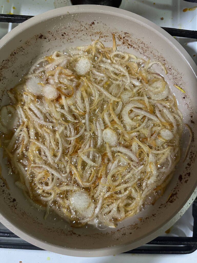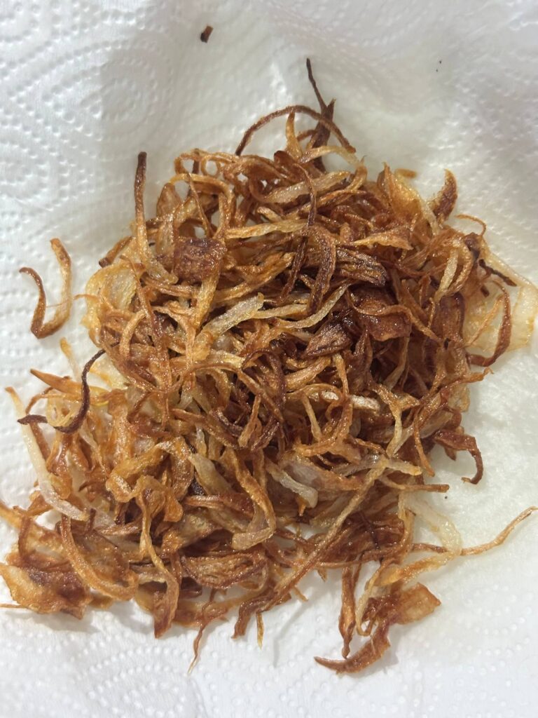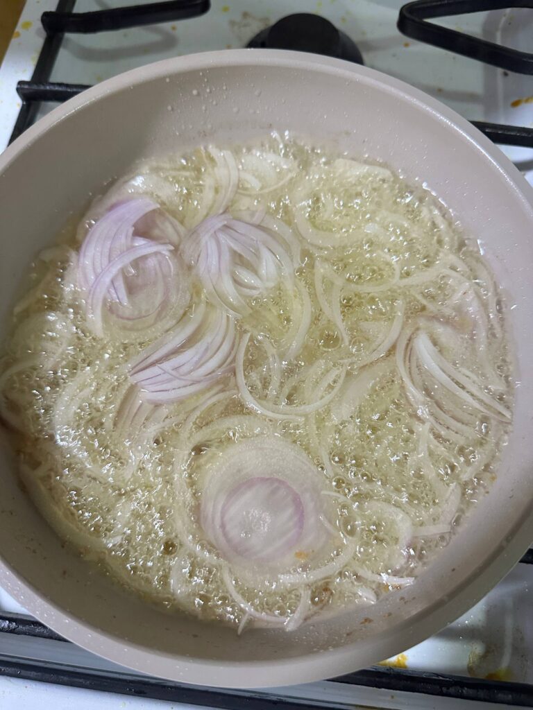 Hiris bawang besar merah nipis-nipis dan goreng sehingga warna keemasan dan angkat.