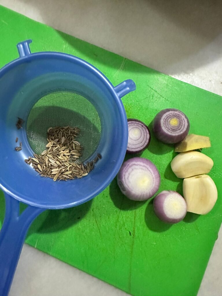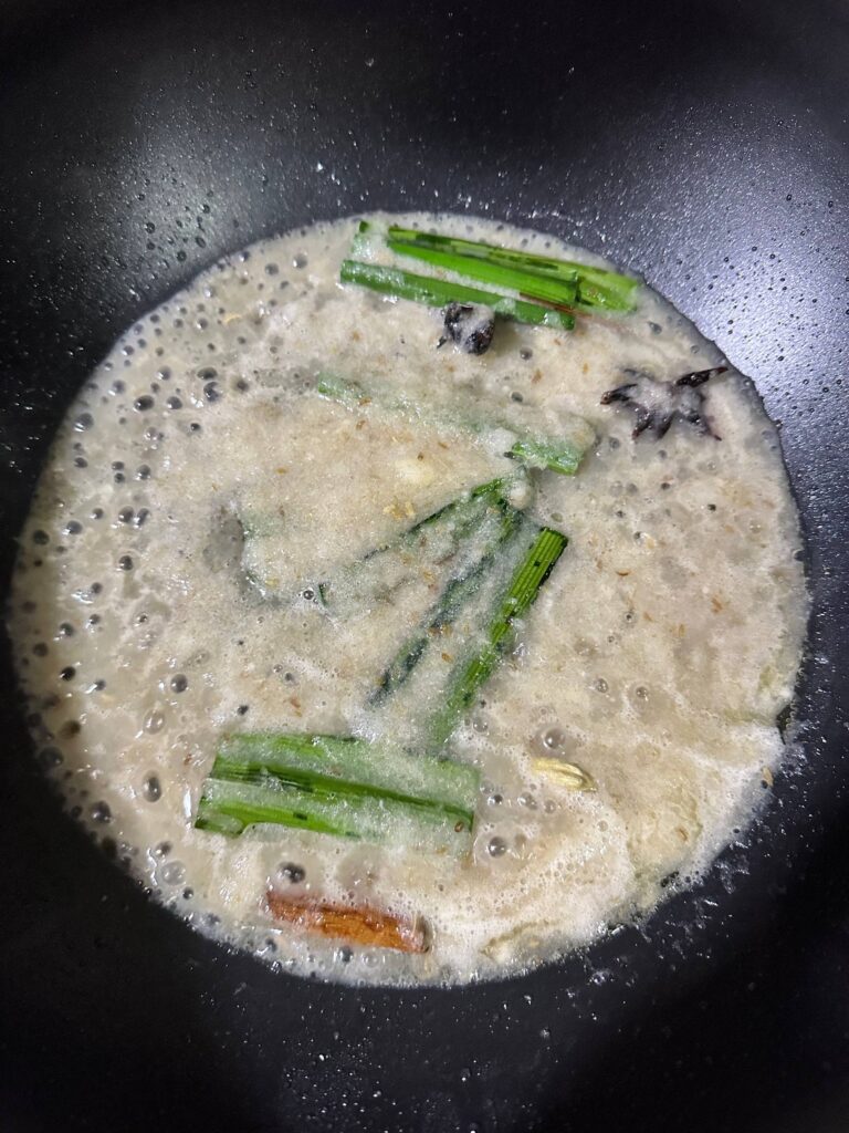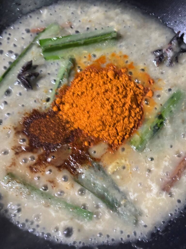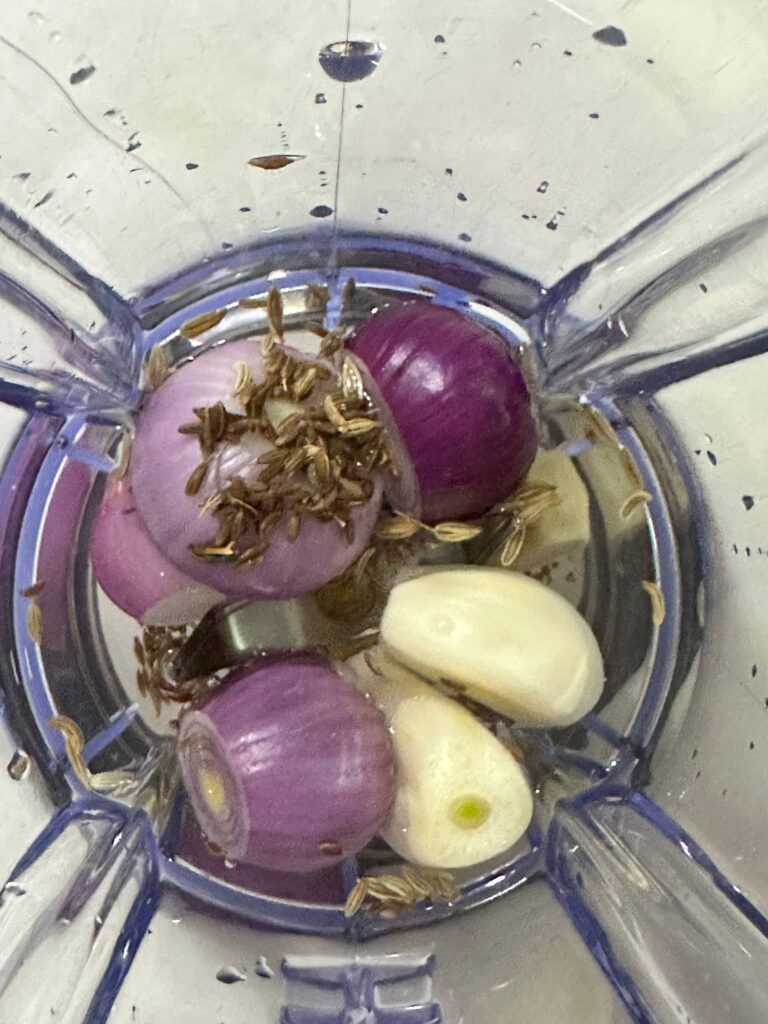 Campurkan semua bahan untuk dikisar di atas; jintan manis, jintan putih, halia, bawang putih dan bawang merah sederhana besar dalam 1 blender, masukkan air secukupnya dan kisar sehingga halus.
