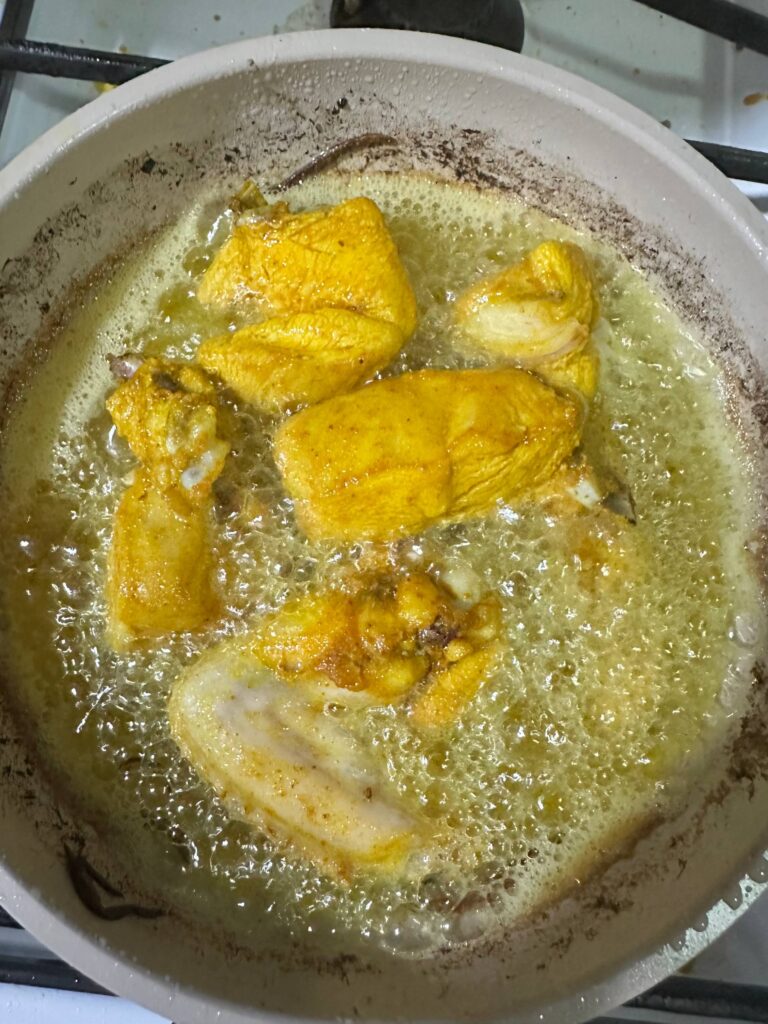 Kemudian.. Gaul ayam dengan kunyit dan garam dan kemudian….Goreng ayam.. Tak garing & tak keras.. Lembut je daging ayamnya tetapi masak.