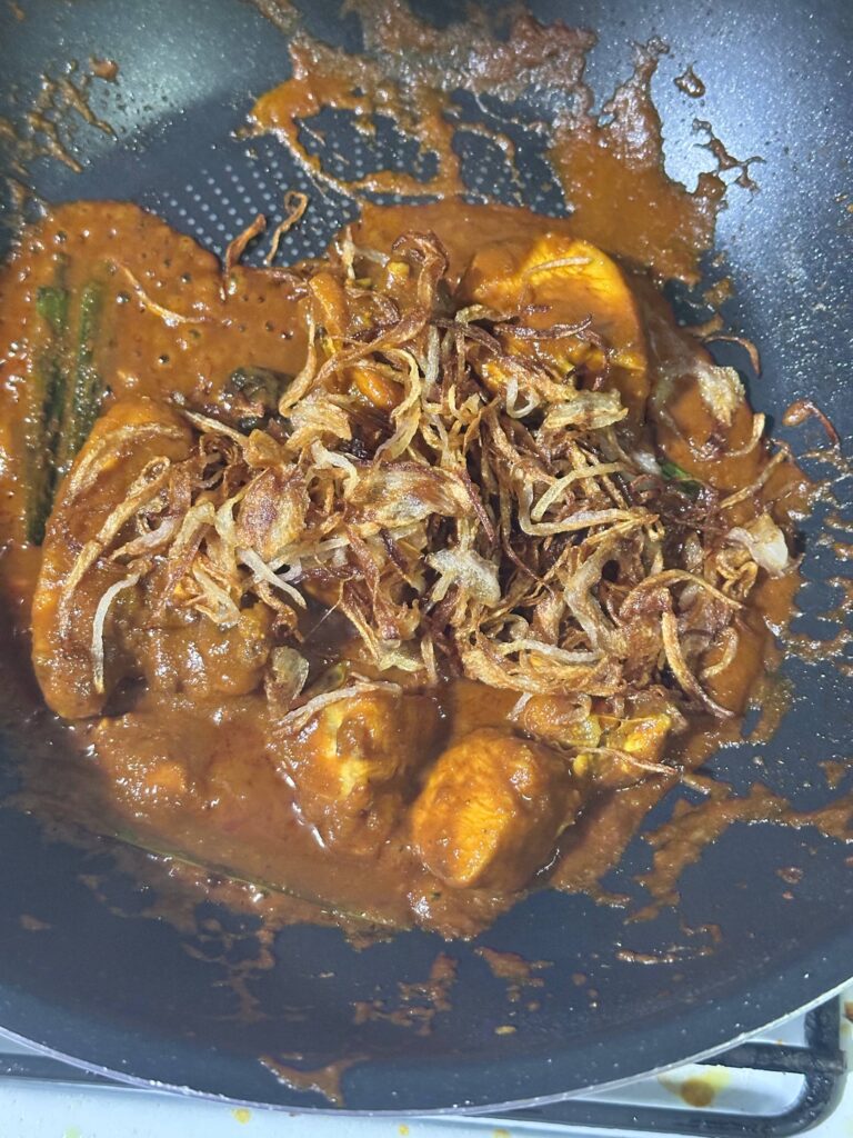 Letakkan sedikit minyak masak dalam kuali / frying pan. Minyak dah panas, letak 3 sekawan; kulis kayu manis, buah pelaga dan juga bunga lawang. Goreng. Nampak 3 sekawan dah mula bengkak, letak daun pandan. Gaul-gaul sekejpa kemudian letak bahan kisar. Masukkan serbuk kari dan juga cayenne pepper. Masukkan sikit air, dalam 1/4 gelas. Dah rata serbuk kari dan cayenne pepper dengan bahan kisar, letak kicap lemak manis 1 sudu. Masukkan sikit air, dalam 1/4 gelas. Sambil tu letak sos cili dan gram secukup rasa. Gaul dan letakkan serbuk lada putih ajishio secukup rasa juga. JIka nampak pekat, masukkan lagi sikit air, dalam 1/4 gelas. Gaul. bagi tumisan kuah mesra dan dapatkan teksture serbuk kari dan cayenne halus. Masukkan ayam goreng tadi dan sambil tu masukkan lagi sikit air, dalam 1/4 gelas. Dah okay, tutup api dan letak semua bawang goreng tadi. Gaul-gaulkan.